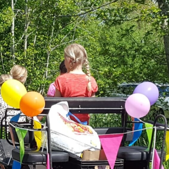 - Zakje chips worden uitgedeeld waarna de jarige rijd op*/wandelt met Loesje onder begeleiding richting de auto’s